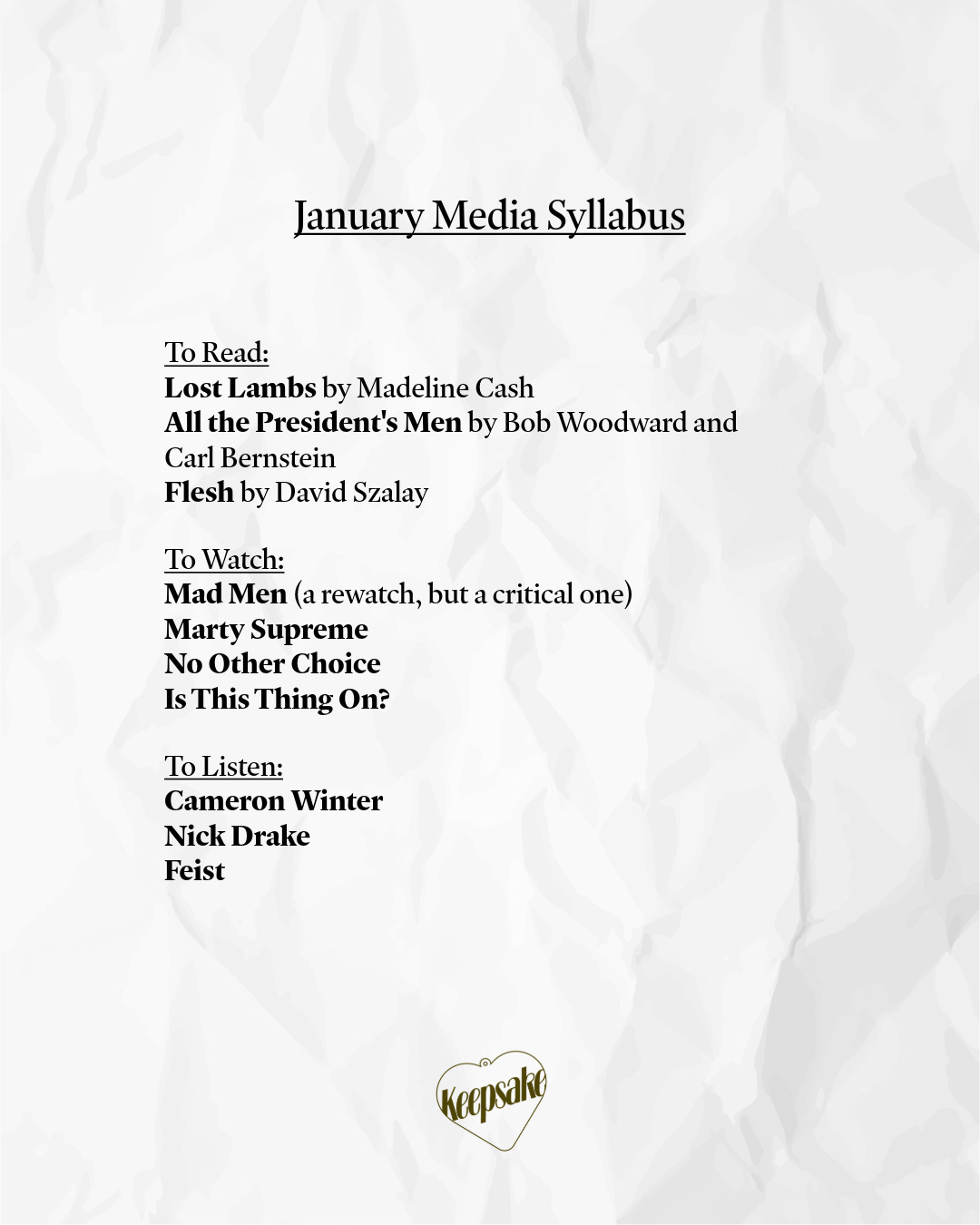 January Minigame: Create a little syllabus for media you’d like to get into. Maybe you create a more official TBR list, or include some movies you’ve been meaning to see. Maybe you have a subscription to The New Yorker and you’re behind on your articles.